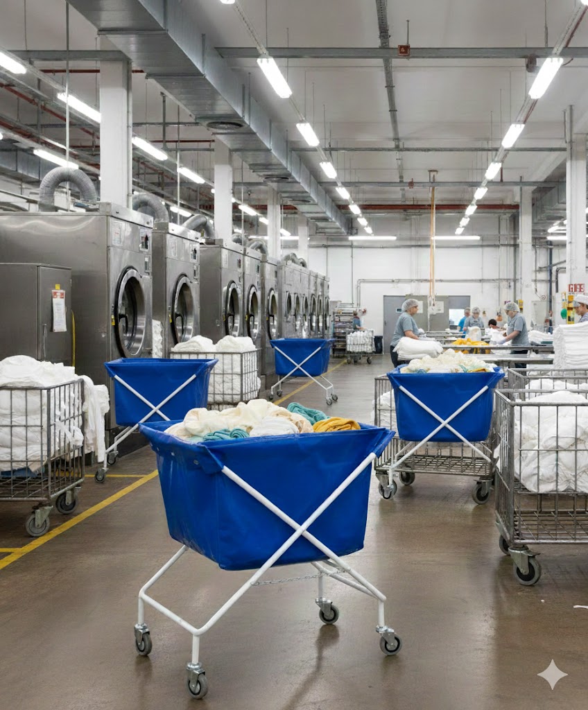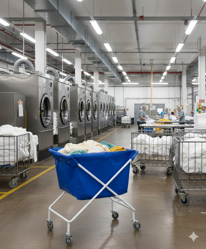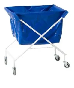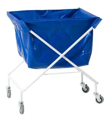 Sammenklappelig rørvogn med slidstærk plastpose og 4 drejelige hjul. Ideel til transport af vasketøj i vaskerier, hoteller og institutioner.