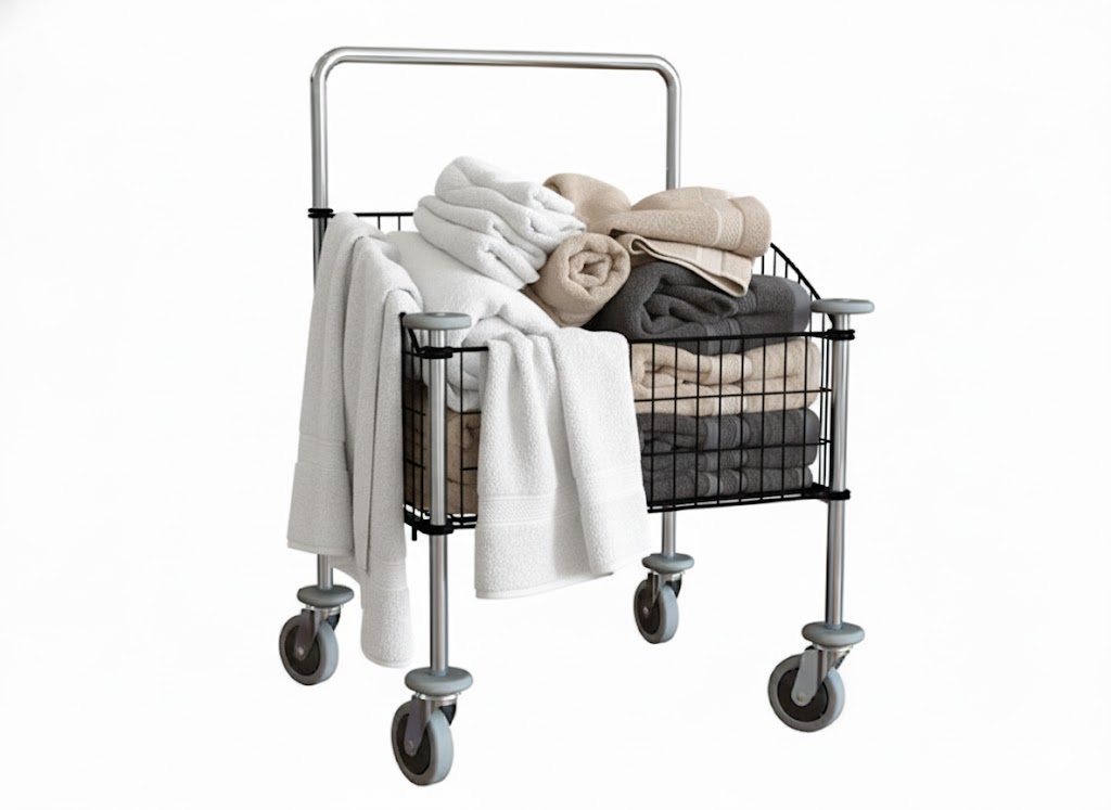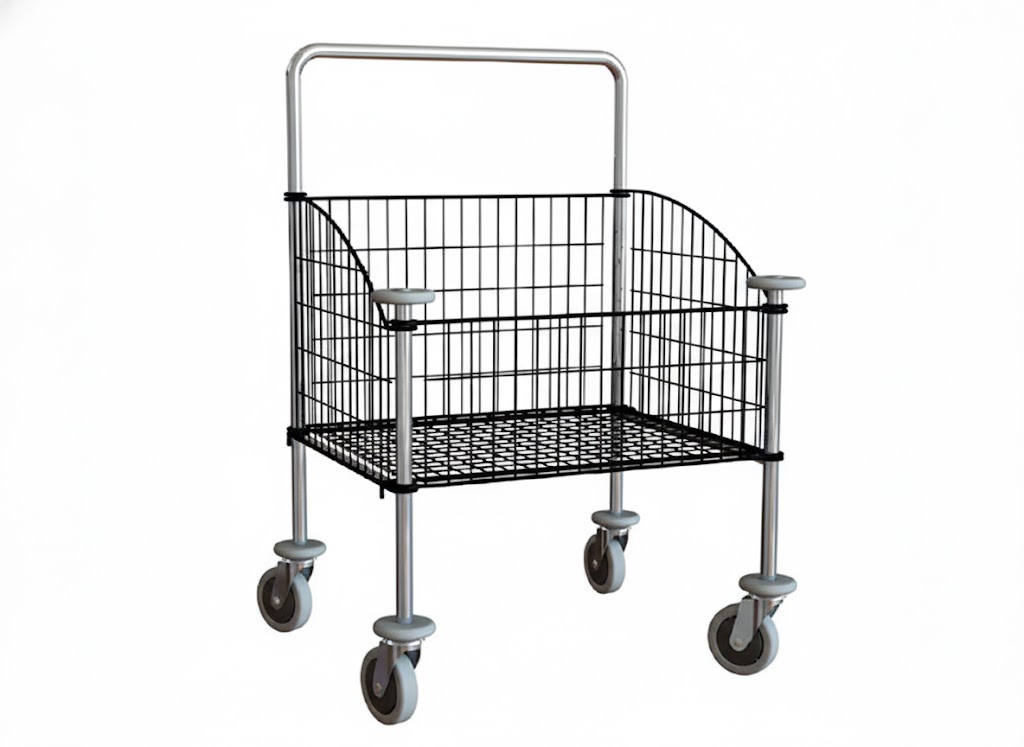 Sammenklappelig kurvevogn med 65 liters kapacitet og stødhjul – ideel til vaskerier, hospitaler og hoteller. Ergonomisk design og nem montering.